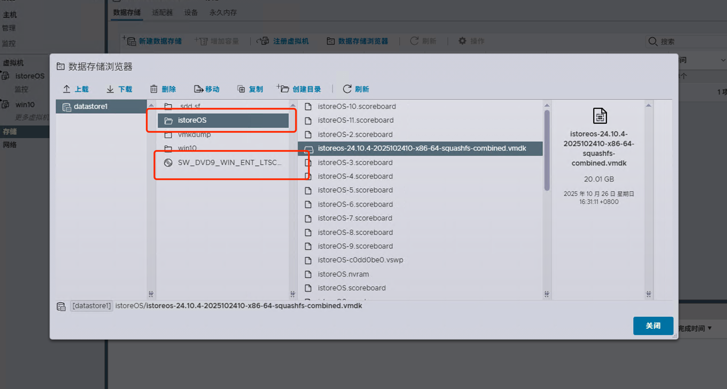 通过数据存储浏览器将生成好的两个.vmdk文件上传到虚拟机,如你的虚拟机名称叫iStoreOS,则你就上传到这个目录下(没有就新建),需要跟下方你命名的虚拟机名称保持一致。