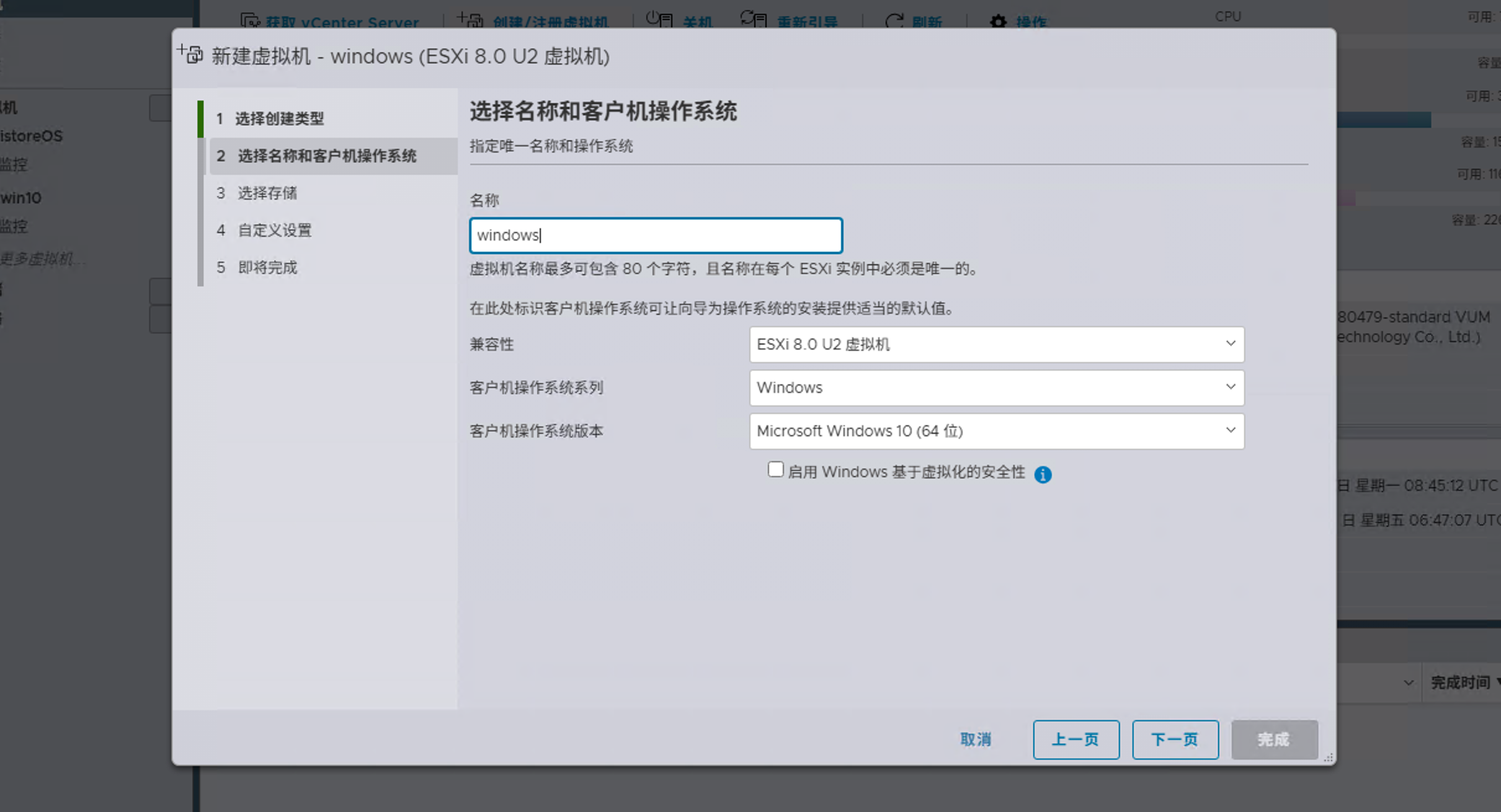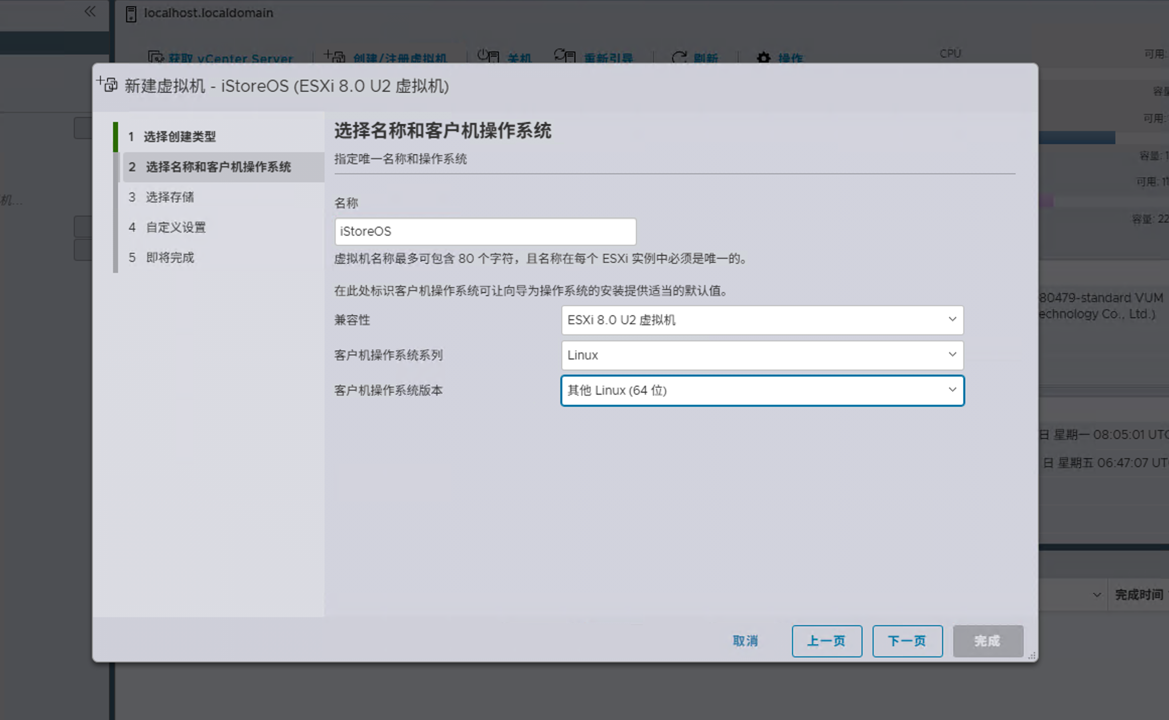 填写虚拟机名称(如 “iStoreOS”),兼容性选择 “ESXi 8.0 U2虚拟机”,客户机操作系统系列选 “Linux”,版本选 “Linux 64 位”,点击 “下一步”