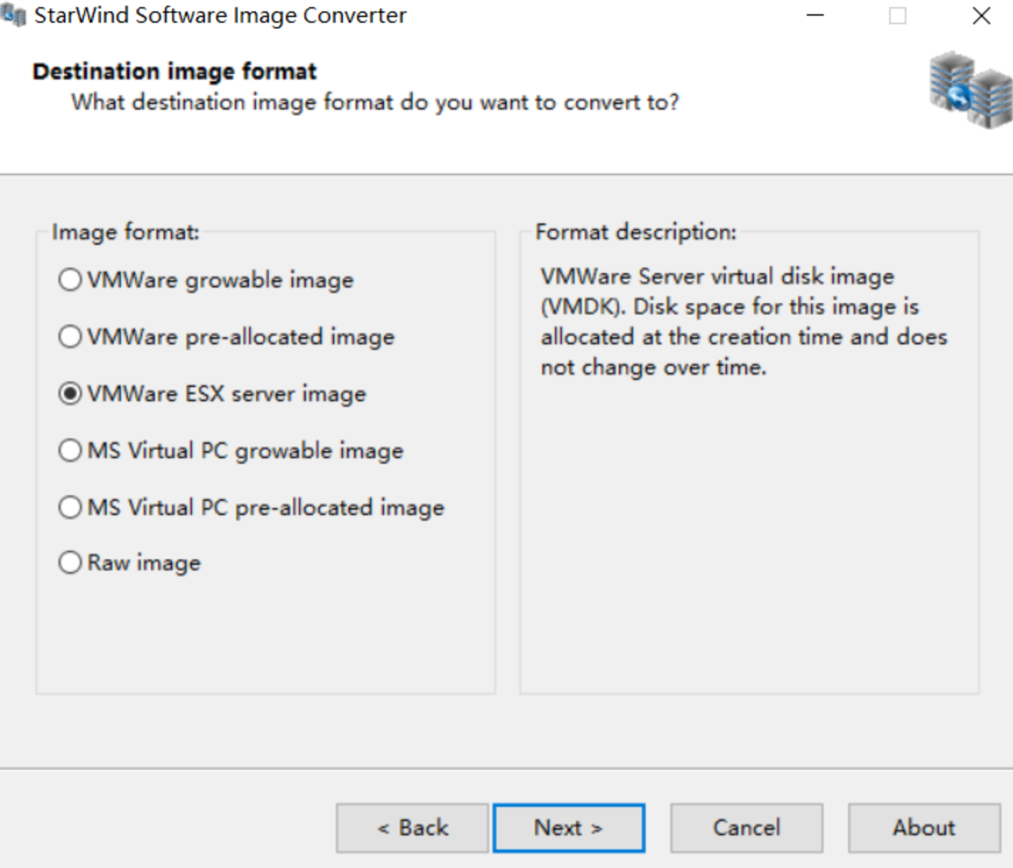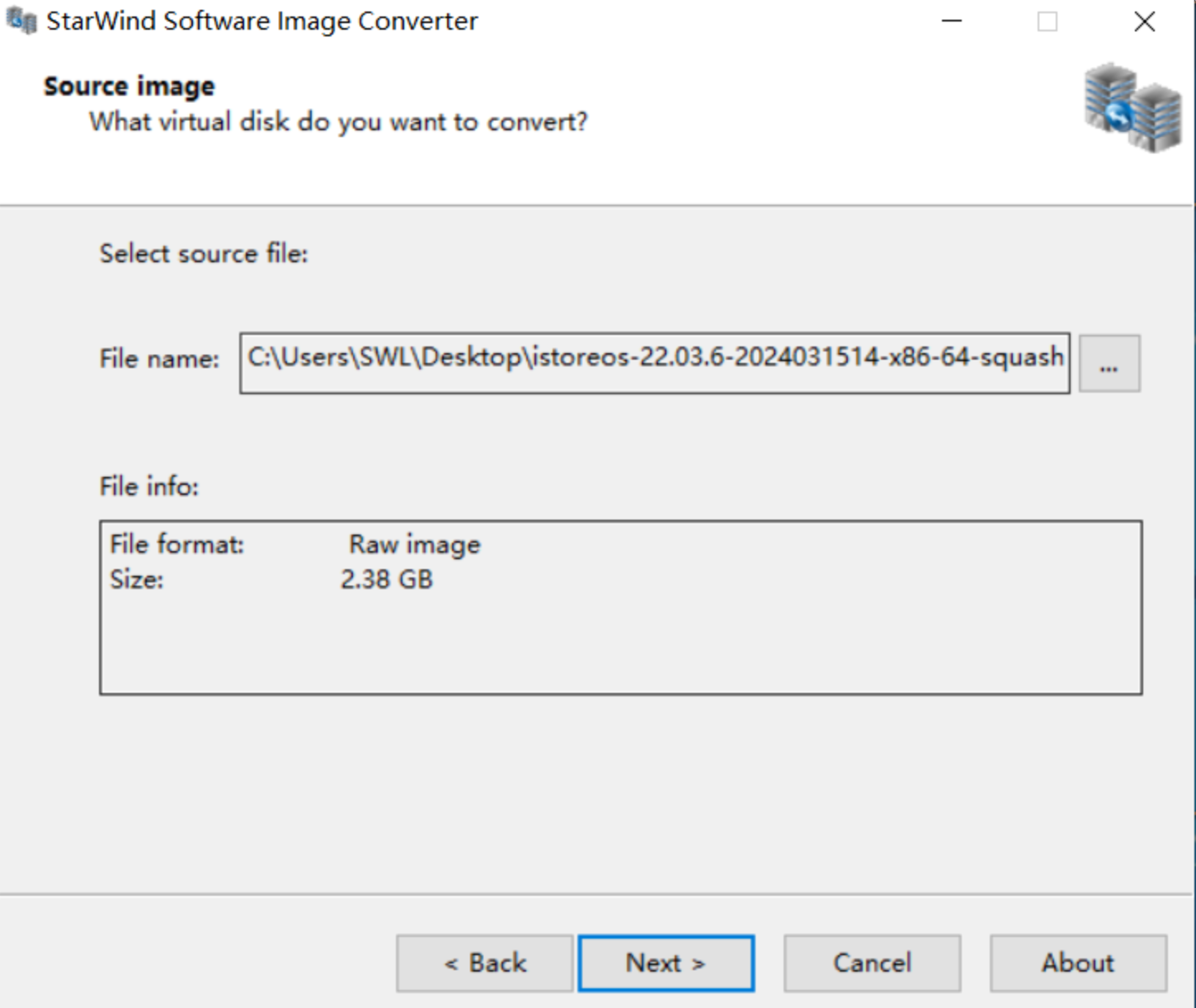 下载并安装 StarWind V2V Converter,打开后选择 “Local file” 作为源,浏览选择下载的istoreos-xxx.img