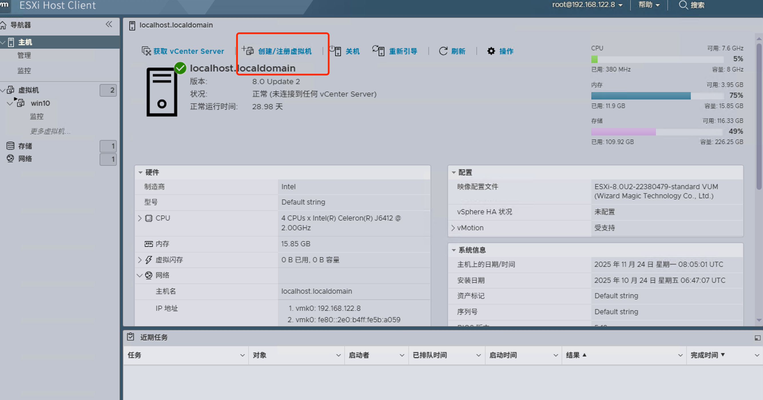 ESXi 8.0 已部署完成,物理机需支持虚拟化(CPU 开启 VT-x/AMD-V),预留至少 1 核 CPU、1GB 内存、8GB 存储(建议 16GB 以上,用于存储扩展)。