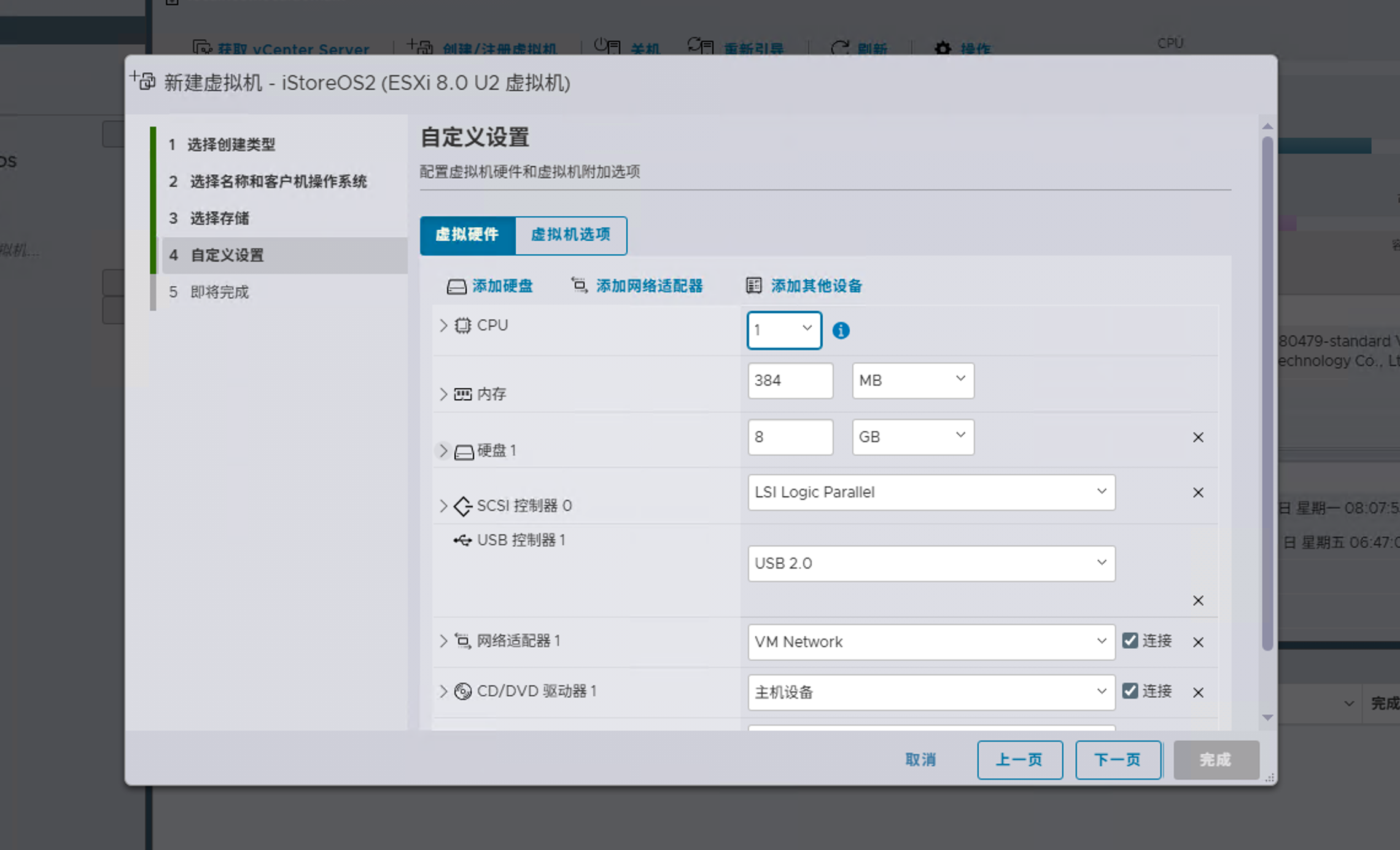 硬盘:删除默认硬盘,点击 “添加”→“硬盘”→“现有硬盘”,浏览选择转换后的istoreos-xxx.vmdk文件
